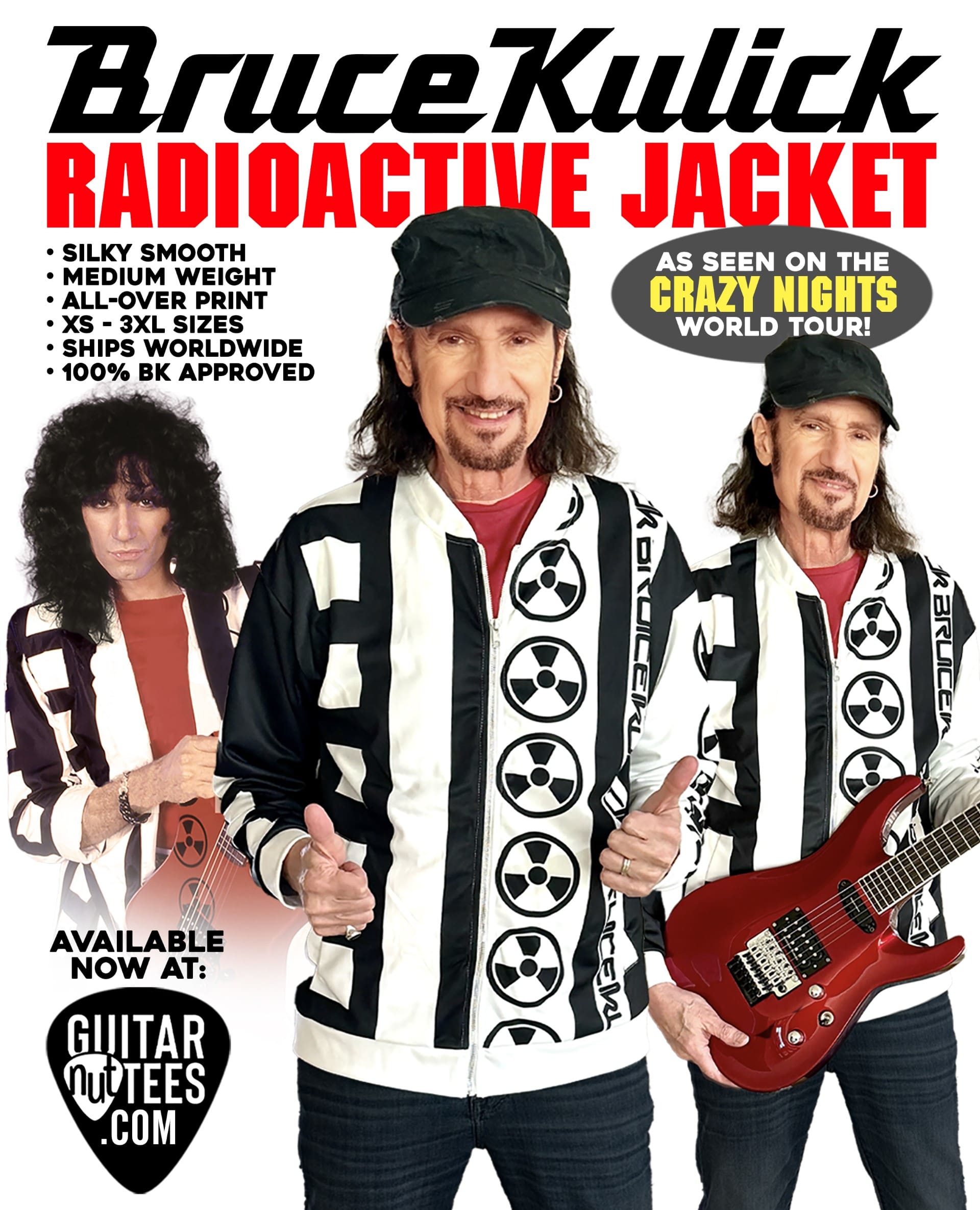 Bruce’s most iconic KISS outfit is now reimagined as a bomber jacket! Introducing the Bruce Kulick Radioactive Bomber Jacket—a must-have for any KISS fan of the Crazy Nights era!